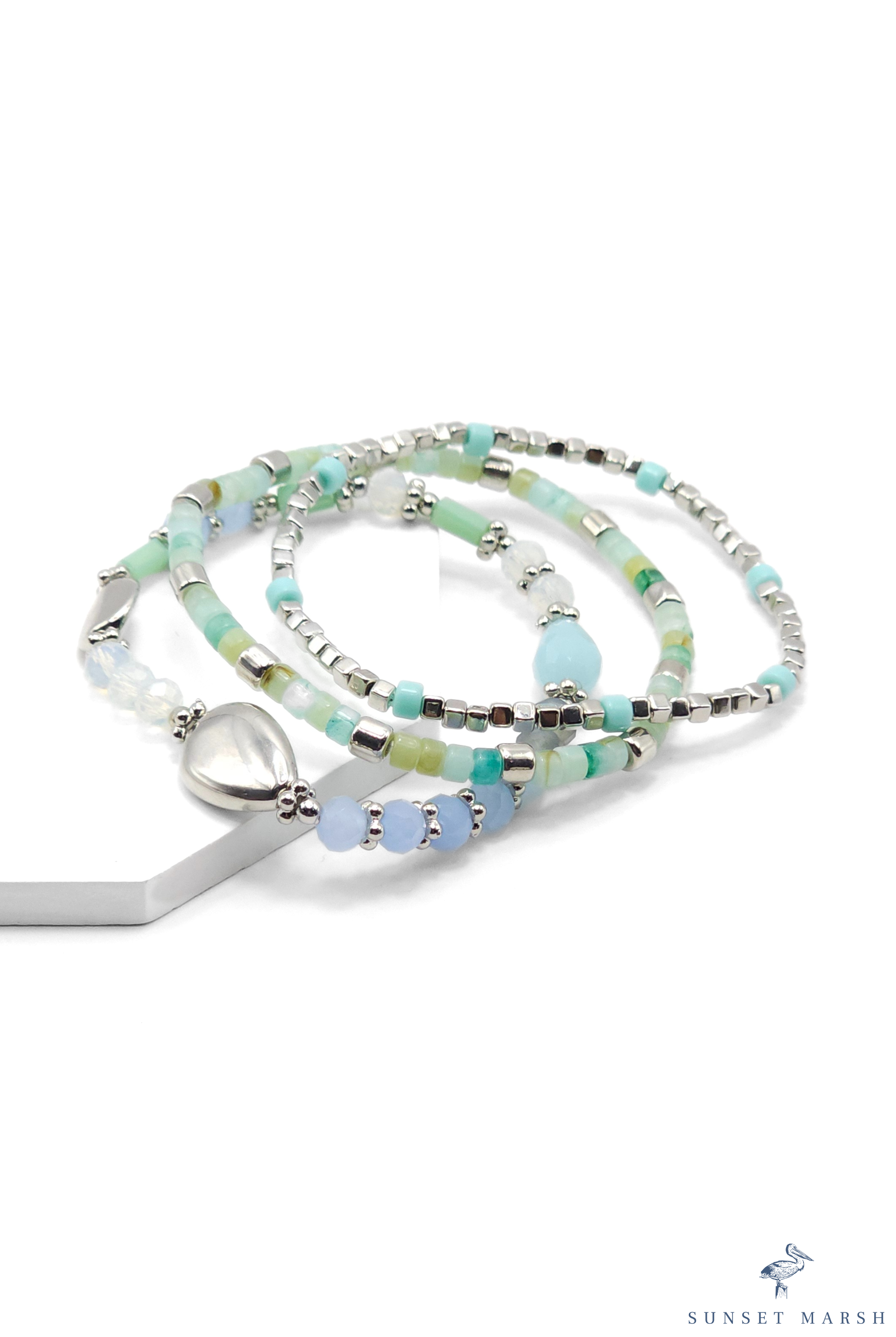 This playful multi-strand bracelet wraps your wrist in cool tones of mint, aqua, sky blue, and silver for a fresh, beachy vibe. Featuring a mix of smooth and faceted beads, tiny silver spacers, and a heart-like silver charm, it brings a light and breezy look that’s effortlessly fun. The stretchy design makes it easy to slip on and off, perfect for stacking or wearing solo on sunny days.