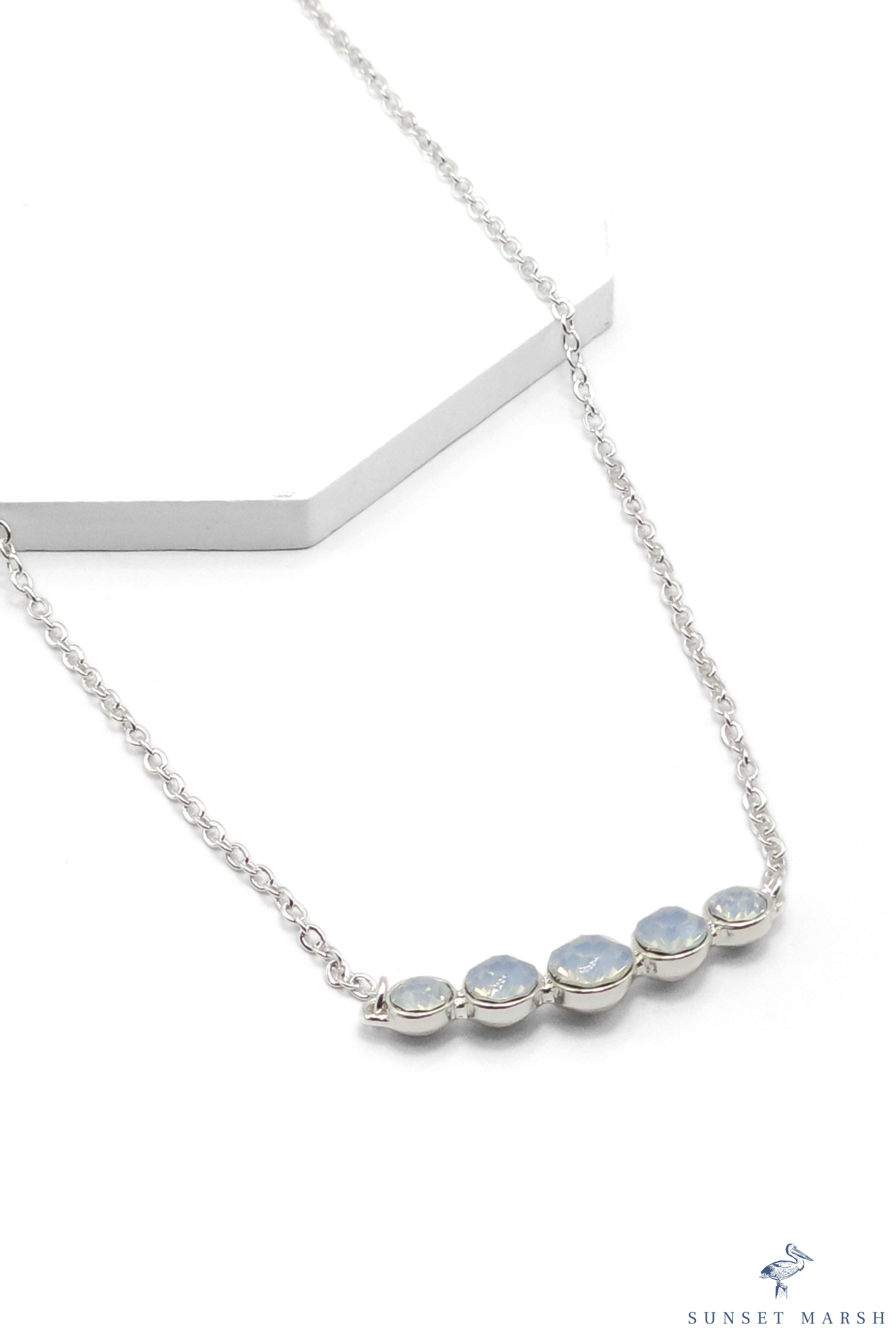 This elegant silver necklace features a row of five luminous opalescent stones, each with a dreamy, iridescent glow that shifts with the light. Set in a sleek silver bezel and anchored by a delicate chain, this piece brings a soft, ethereal charm to your look. Whether you’re layering it with other favorites or letting it shine solo, it adds just the right amount of shimmer and sophistication. Perfect for daytime glow-ups or evening elegance, it’s a versatile beauty you’ll reach for again and again.