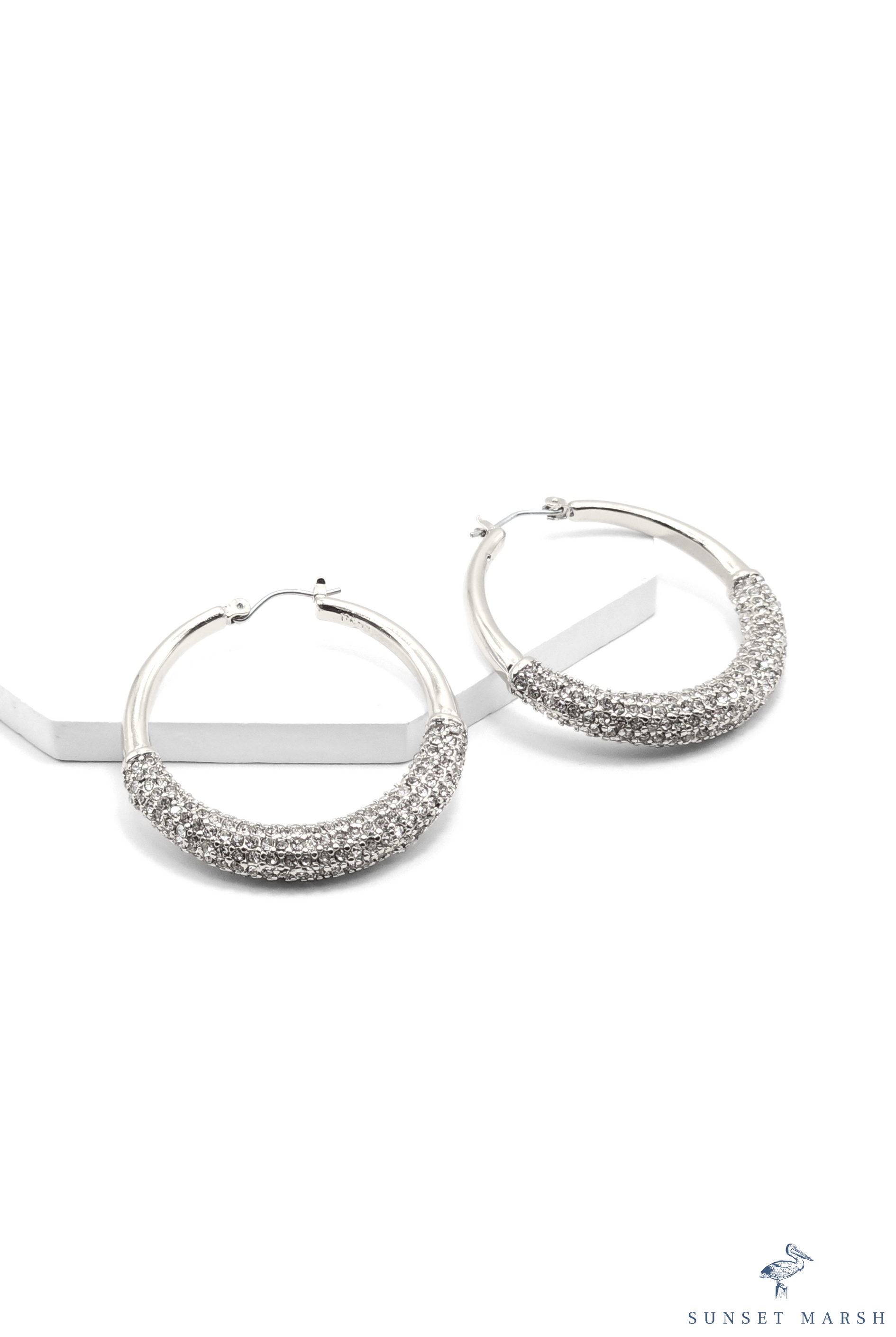 These shimmering silver hoop earrings bring the sparkle in a big way. Drenched in rows of pave-set rhinestones, they catch the light from every angle while maintaining a classic, easy-to-wear silhouette. Bold yet elegant, they’re the perfect statement piece for any occasion—from cocktail nights to holiday parties or even elevating a casual jeans-and-tee moment. Lightweight enough for comfort, dazzling enough to turn heads.