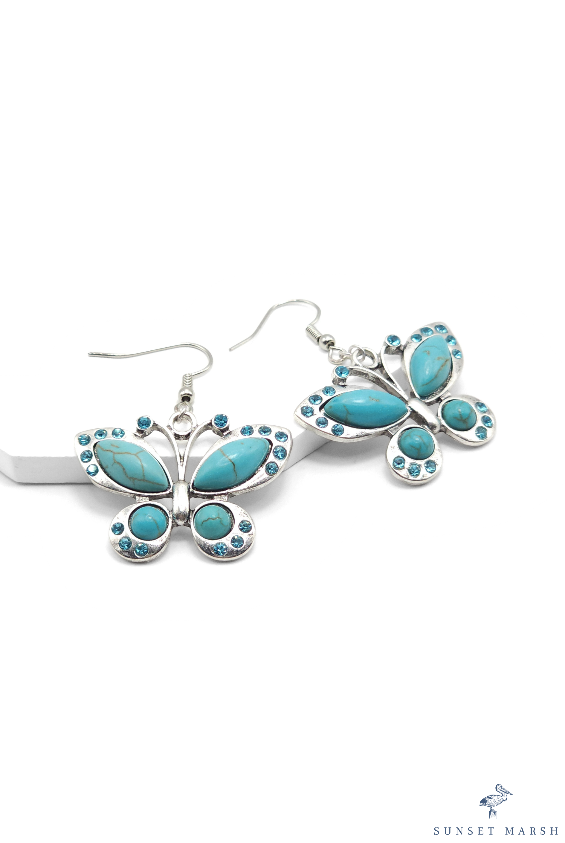 These silver-tone butterfly earrings are a bold and cheerful celebration of nature’s beauty. Each winged design is brought to life with smooth marbled turquoise stones and dazzling round turquoise rhinestones for an extra touch of sparkle. Lightweight and full of movement, these earrings add a playful yet elegant pop of color to your look. Whether worn alone or with the matching necklace, they’re perfect for boho lovers and sunshine chasers alike.