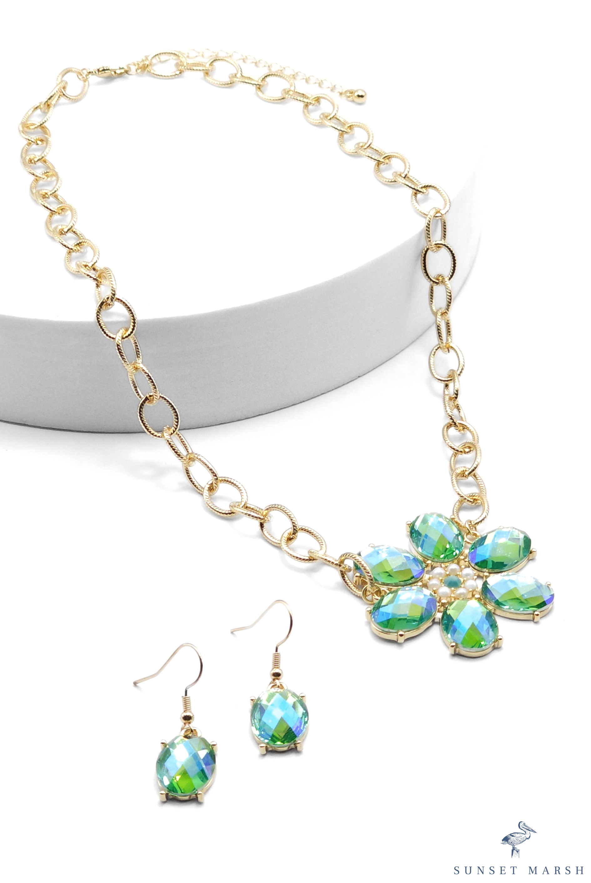 This shimmering necklace set features a bold floral pendant made from iridescent green and aqua faceted gems that reflect light with every move. Set in a warm gold-tone frame and paired with oversized open-link chain detailing, this piece makes a vibrant statement. The coordinating drop earrings complete the look with matching faceted stones for a cohesive, polished finish. Perfect for adding a burst of color and sparkle to any outfit, this set is a fresh take on fun, floral-inspired glam.