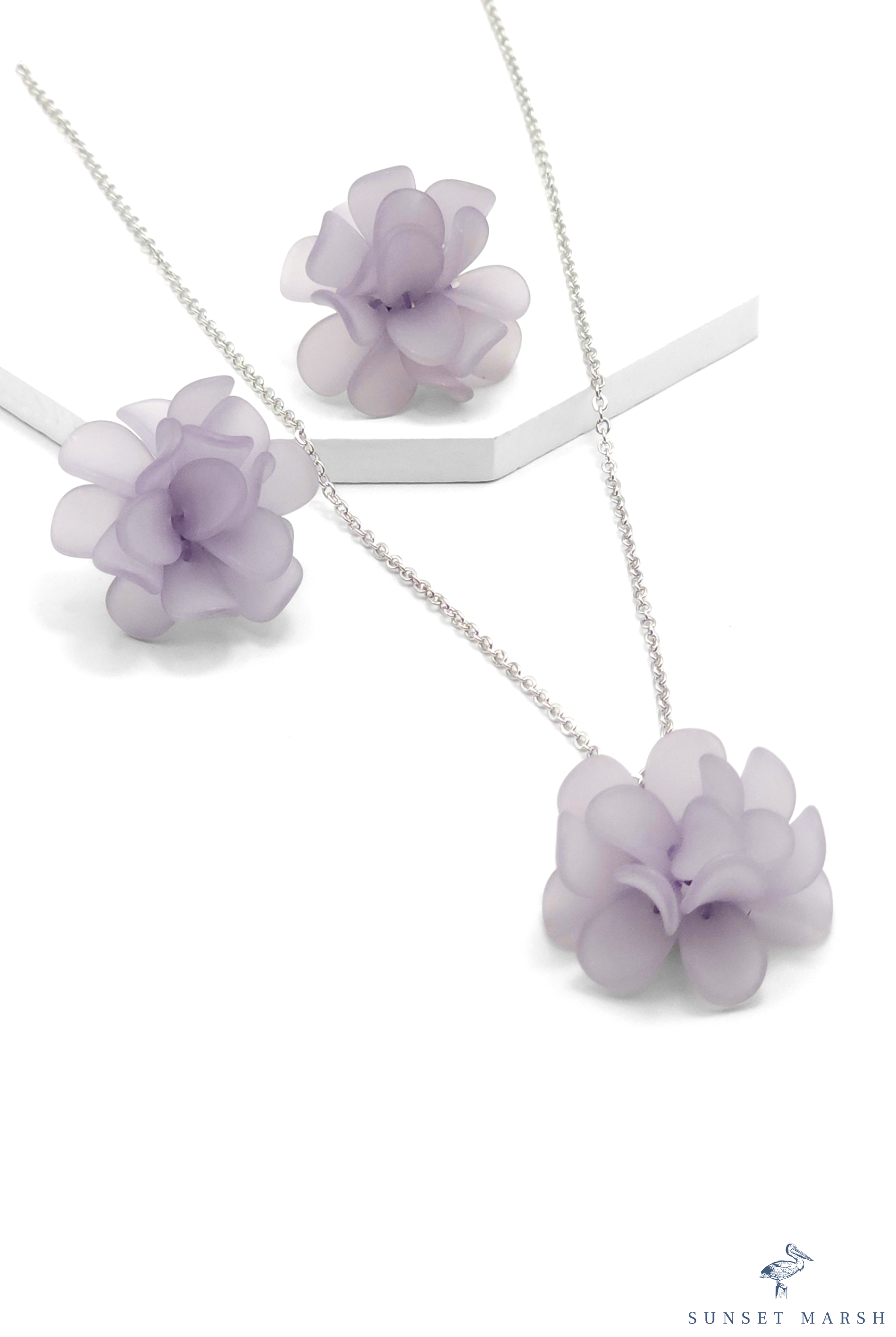 This dreamy set features soft lavender flowers crafted from frosted petals that seem to bloom right off the jewelry. The delicate necklace showcases a single blossom suspended from a fine silver-tone chain, while the matching earrings complete the look with a gentle, feminine touch. Lightweight and ethereal, this set captures the perfect balance of elegance and whimsy — ideal for spring days, special occasions, or whenever you want to add a soft floral flair to your style.