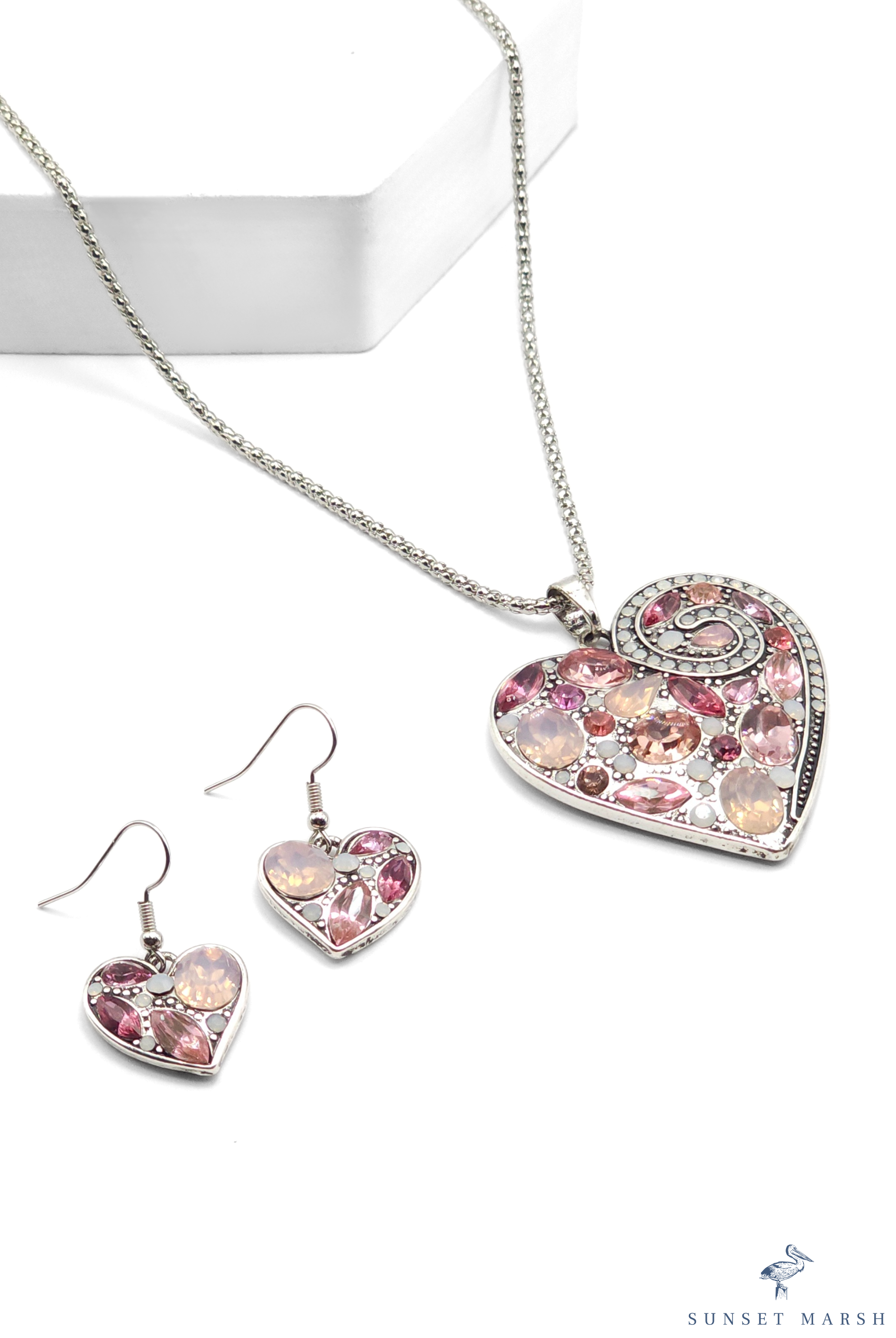 This stunning heart jewelry set captures a perfect blend of romance and elegance. The necklace features a large, silver-tone heart pendant encrusted with an array of blush, rose, and champagne-colored stones, arranged in a beautiful mosaic pattern that sparkles from every angle. A delicate swirl detail adds a whimsical touch, while the matching drop earrings mirror the pendant’s charm in a smaller, lightweight design. Set on a sleek silver chain, this duo offers just the right amount of shimmer — ideal for adding a feminine, graceful glow to both everyday looks and special occasions.