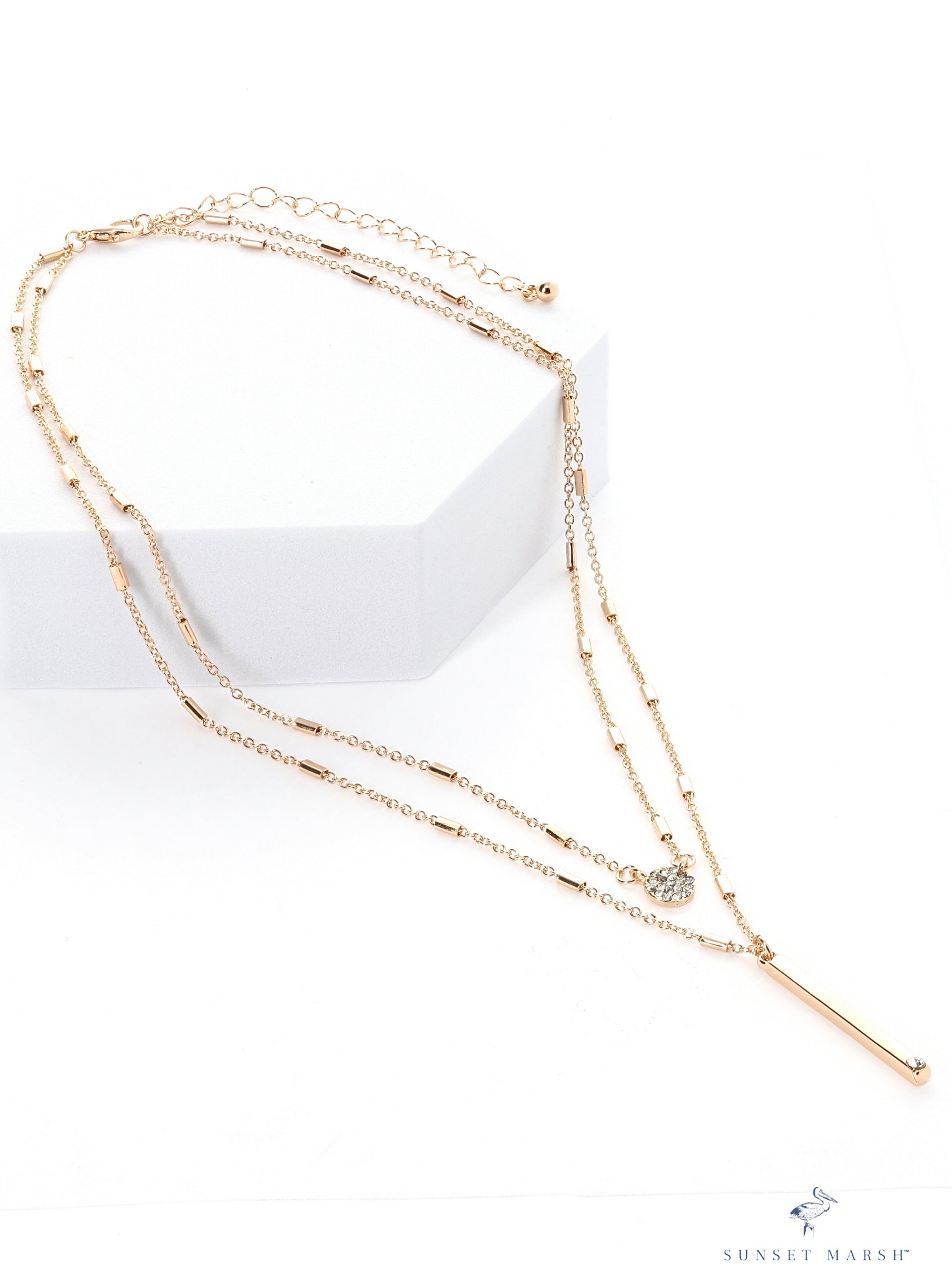 This dainty layered necklace brings effortless elegance to any look. Featuring three delicate gold-tone chains, each with its own unique texture and spacing, it creates a light and airy cascade that flatters the neckline. One layer is accented with a tiny crystal charm for a hint of sparkle, while the longest layer is finished with a sleek vertical bar pendant that adds a modern, minimal touch. Perfect for everyday wear or subtle layering with other pieces, this necklace is your new go-to for chic, understated style.