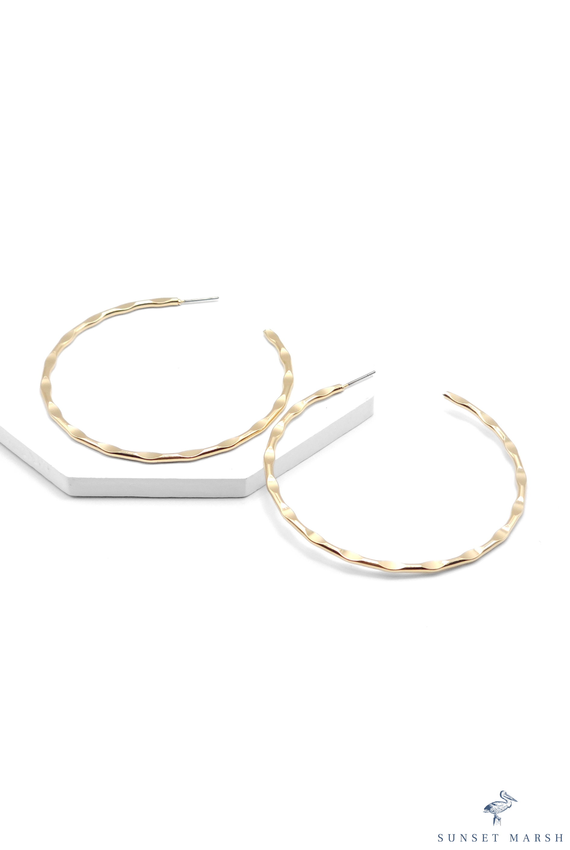 These gold-tone open hoop earrings feature a softly twisted, wave-like design that adds movement, texture, and shine with every turn. Their unique sculpted silhouette sets them apart from traditional hoops, while still offering the versatility and ease of an everyday accessory. Lightweight and comfortable, they effortlessly elevate casual outfits and pair beautifully with dressier looks, making them a go-to piece for both day and night. Whether you’re heading out for brunch or dressing up for an evening out, these earrings add that perfect golden touch of modern elegance.