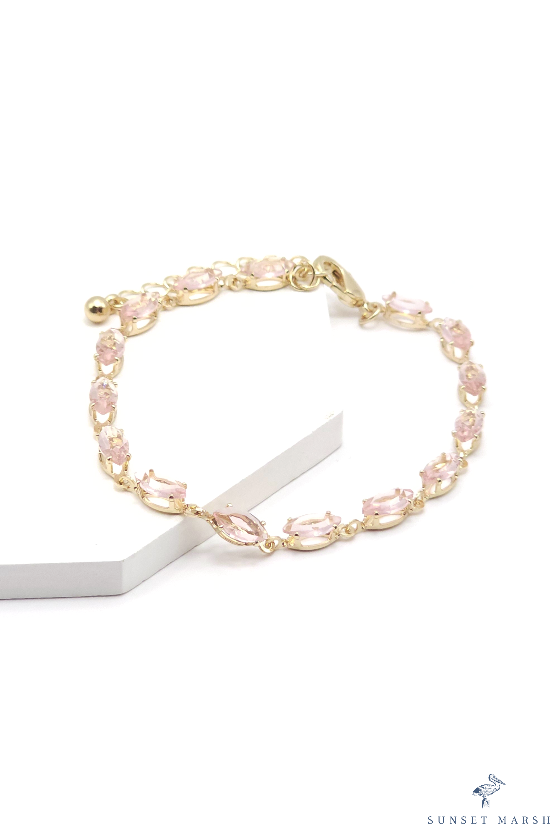 This gold-tone bracelet features a delicate chain of alternating marquise and oval blush pink beads, creating a soft, romantic look that’s effortlessly elegant. Each bead is set in a graceful looped frame that adds movement and shimmer with every turn of the wrist. Finished with a secure clasp and subtle extender for the perfect fit, this bracelet is the ideal finishing touch for both everyday wear and special occasions.