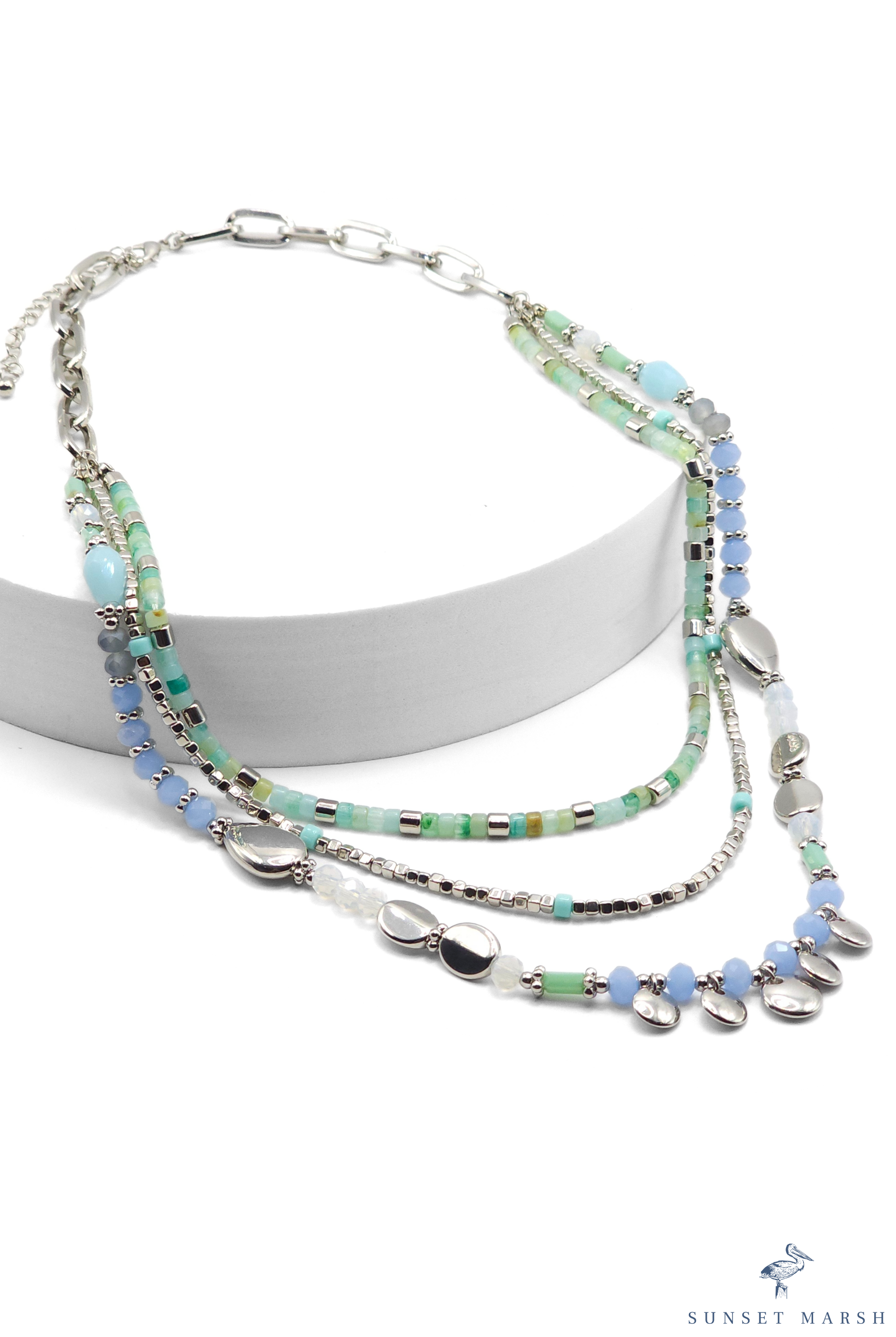 This layered necklace brings a refreshing, coastal vibe with its mix of pastel green, aqua, and soft blue beads paired with glimmering silver accents. Three strands of varied textures and shapes—including smooth teardrops, metallic discs, and delicate seed beads—create a playful yet sophisticated cascade effect. The mix of cool tones and shimmering finishes gives it a breezy, beachy elegance that’s perfect for adding dimension and color to everyday outfits or vacation-ready looks.