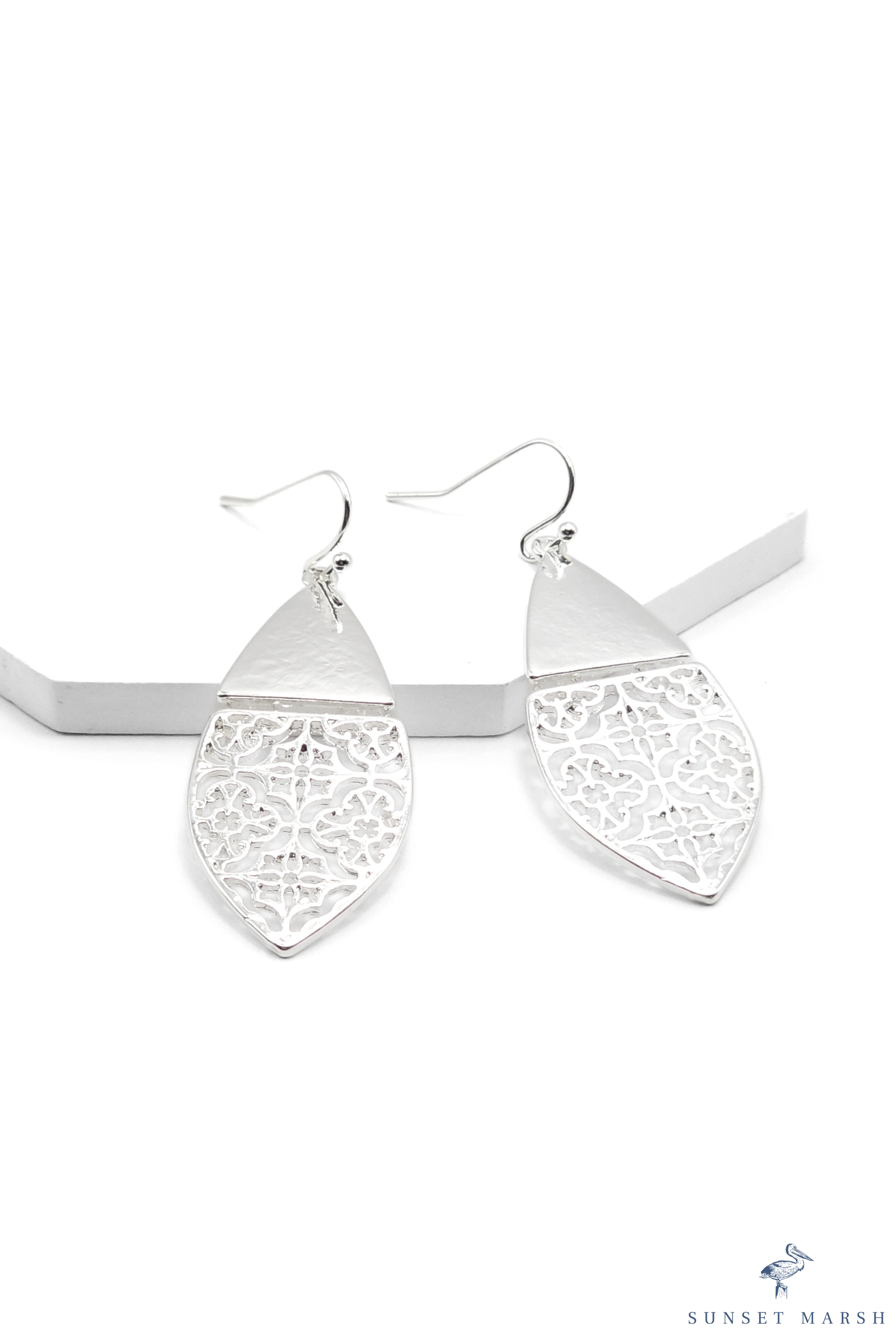 These elegant silver-tone earrings feature a sleek hammered top section paired with an ornate filigree bottom, creating a beautiful mix of texture and intricate detail that catches the light with every movement. Lightweight and versatile, they offer just the right amount of shine to elevate both everyday and dressier looks. Perfect for adding a touch of sophistication, these earrings bring timeless, effortless charm to any outfit.