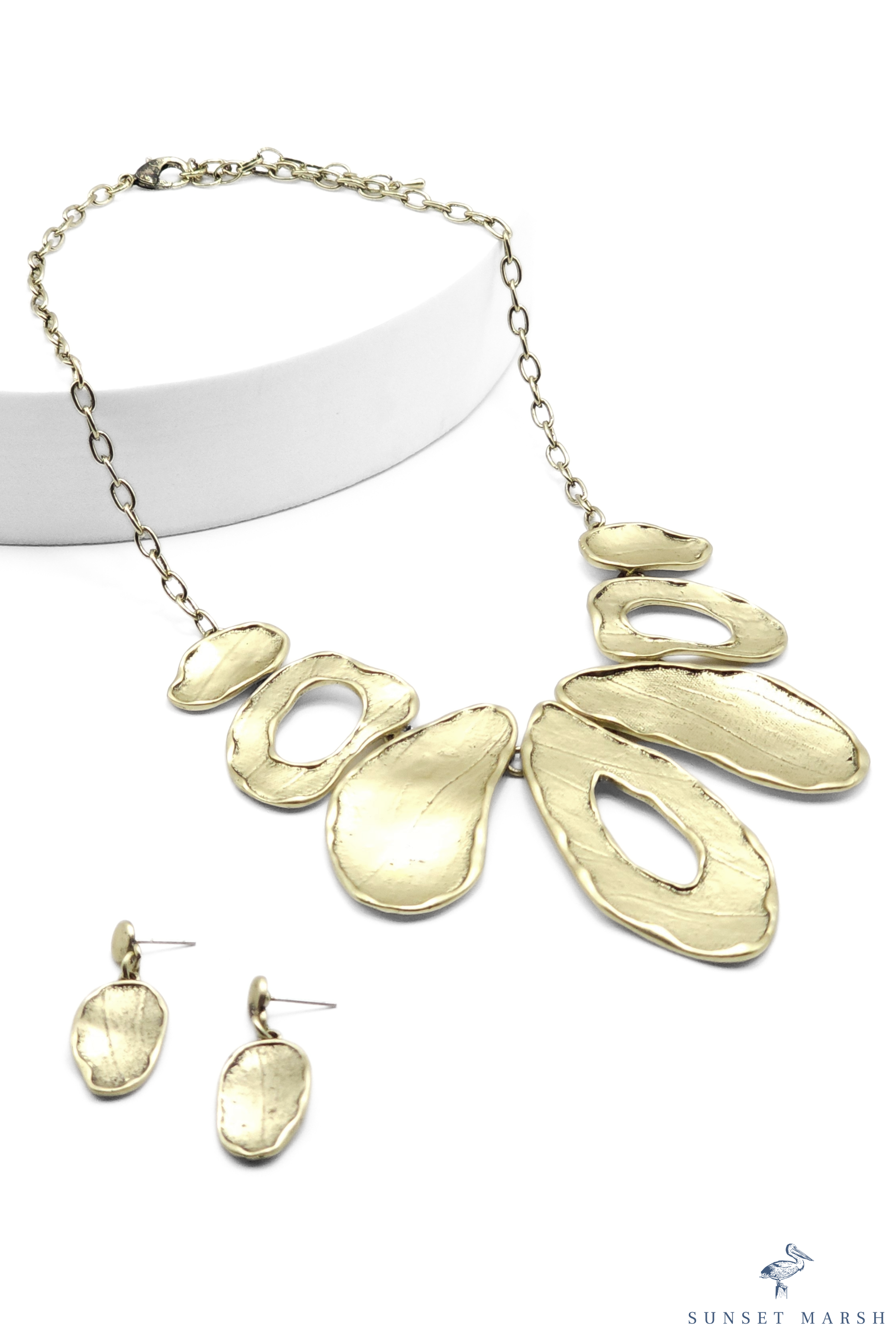 This bold abstract necklace set makes a statement with its organic, freeform gold-toned shapes that catch the light with every movement. The matching earrings complete the look with effortless balance, creating a modern yet artistic vibe. Perfect for those who love standout accessories, this set adds a touch of contemporary sophistication and sculptural elegance to any outfit, from casual chic to evening glam.