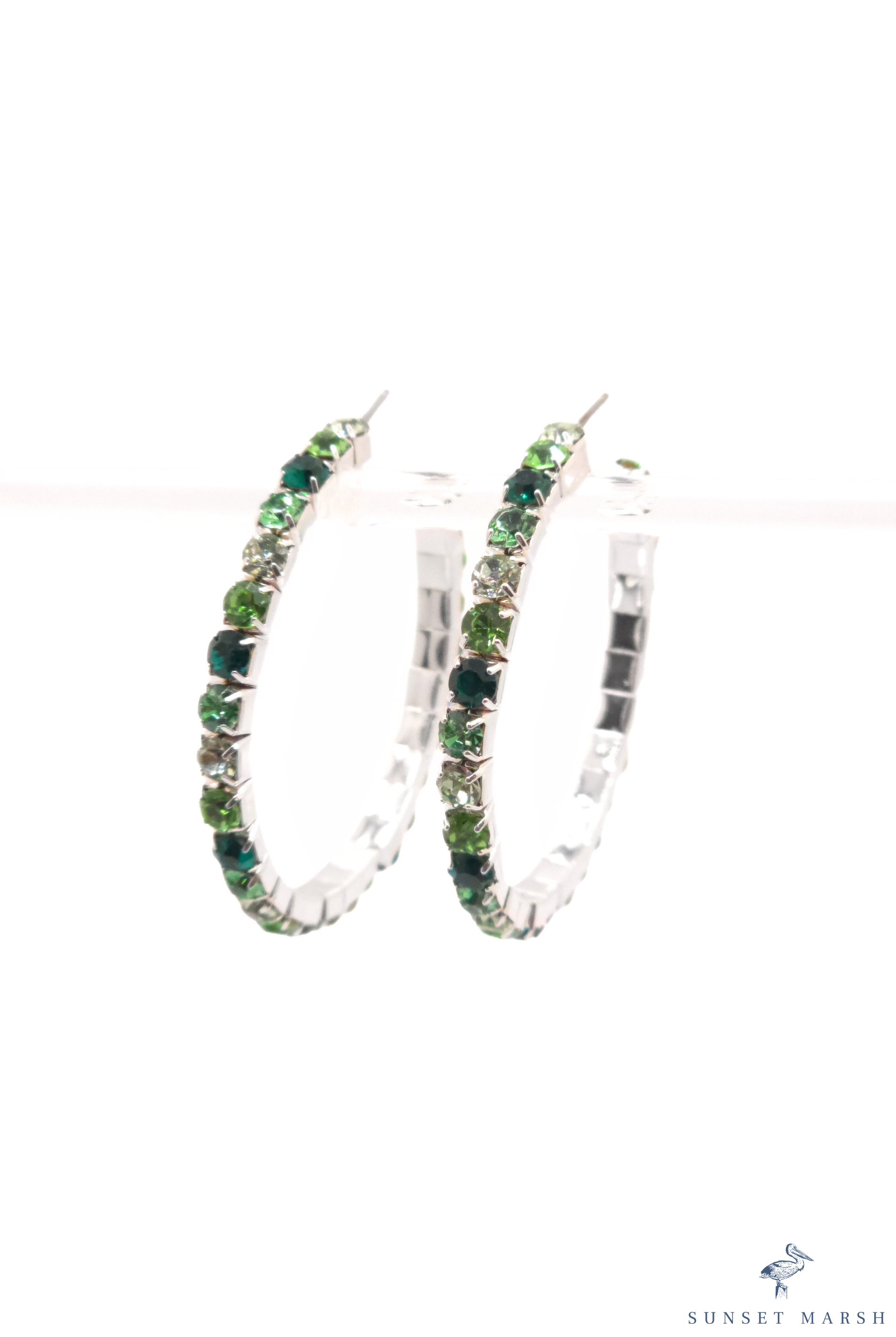 These elegant hoop earrings feature a polished silver-tone setting lined with alternating green crystals in varying shades, from deep emerald to bright peridot tones. Each faceted stone is securely prong-set along the front-facing curve, creating continuous sparkle and dimension from every angle. The classic hoop silhouette is elevated by the rich gradient of greens, offering a fresh yet sophisticated look. Designed with secure post backs for comfortable wear, these hoops add vibrant color and refined brilliance to both everyday outfits and special-occasion styling.