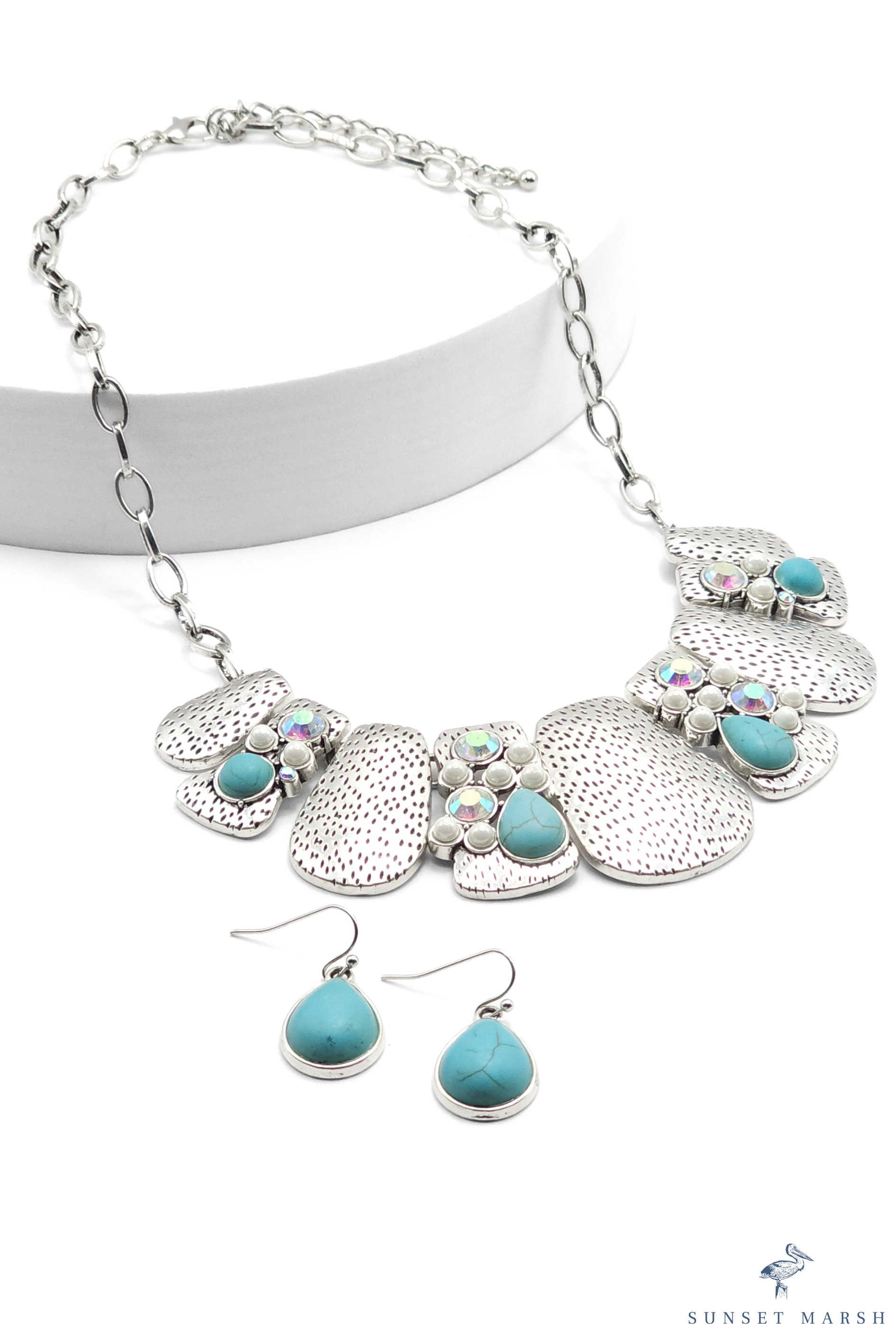 This contemporary statement jewelry set features a silver-tone necklace with organically shaped hammered panels accented by clusters of iridescent crystals and smooth turquoise stones for a bright, modern Southwestern touch. The unique arrangement creates a bold yet wearable centerpiece, while the coordinating turquoise teardrop earrings add a simple, polished finish. Perfect for dressing up everyday outfits or adding a pop of color to boho and Western looks, this set brings effortless charm and eye-catching shine.