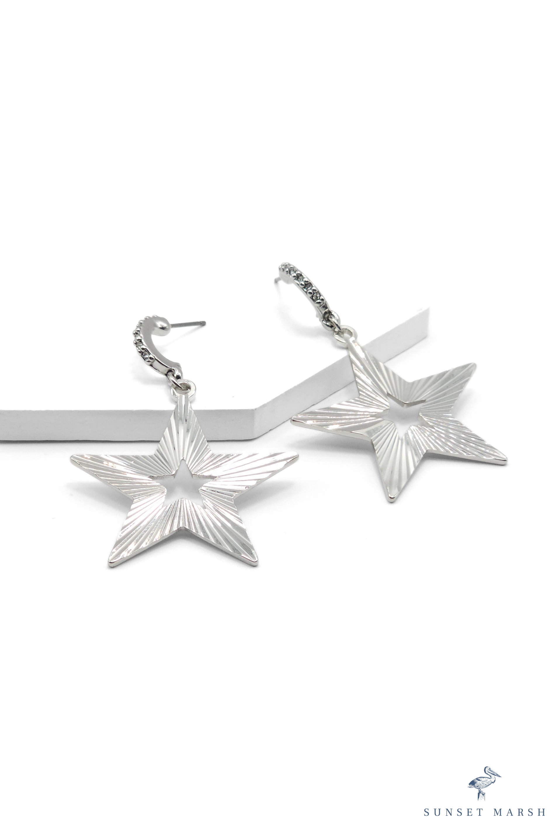 These shining silver-tone earrings feature bold star silhouettes with a sleek cutout center and textured rays that catch the light beautifully. Their modern design adds a touch of edge while still feeling effortlessly chic, making them the perfect statement piece for both casual and dressy looks. Lightweight and eye-catching, these stars bring a little extra sparkle to any outfit — whether you’re lighting up a night out or adding flair to your everyday style.