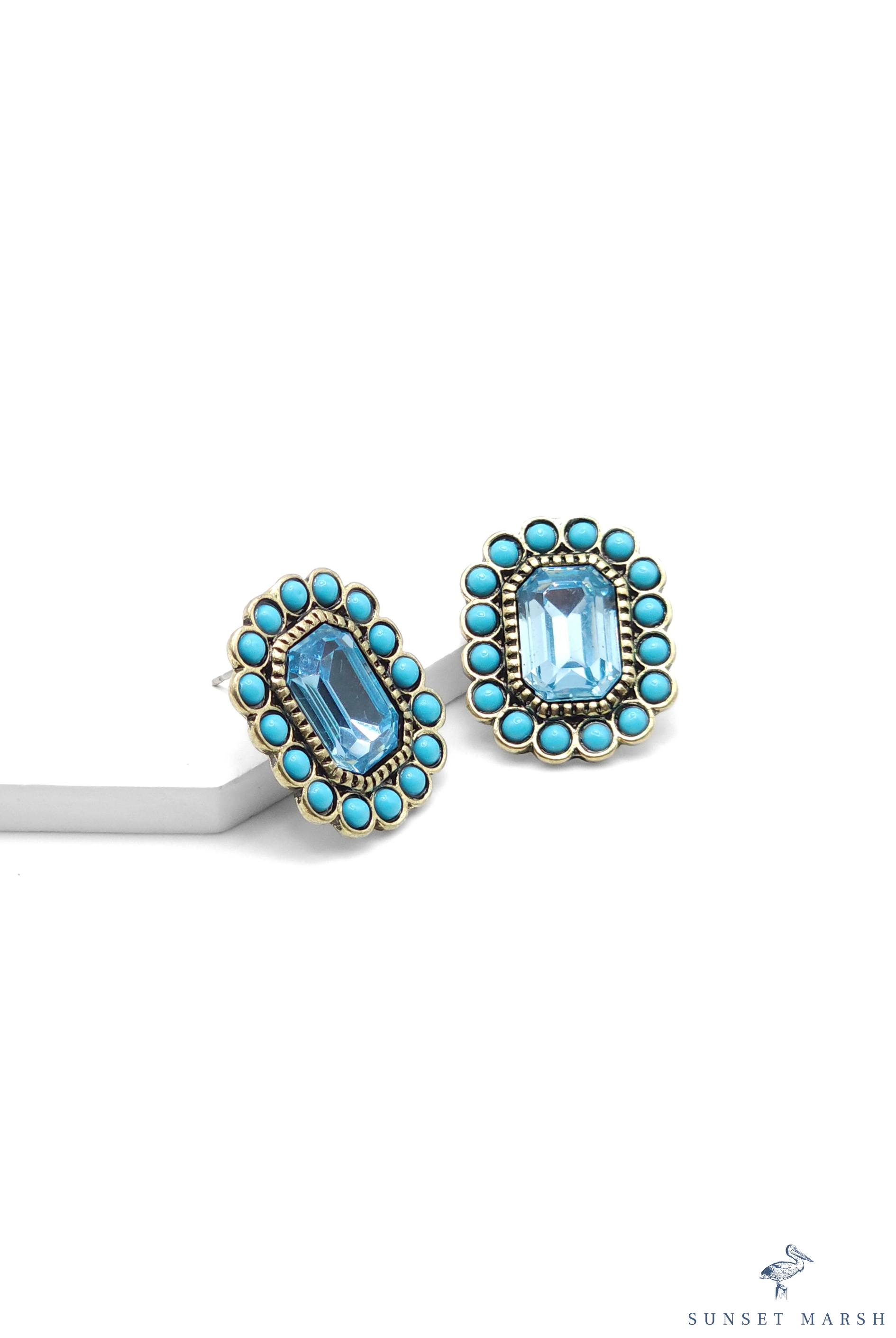 These vintage-inspired stud earrings feature a striking emerald-cut blue gem at the center, surrounded by a border of vibrant turquoise cabochons and antique gold detailing. The bold yet timeless design offers a pop of color with a touch of Western charm, making them a perfect accessory for everyday wear or to elevate a classic denim-and-boots look.