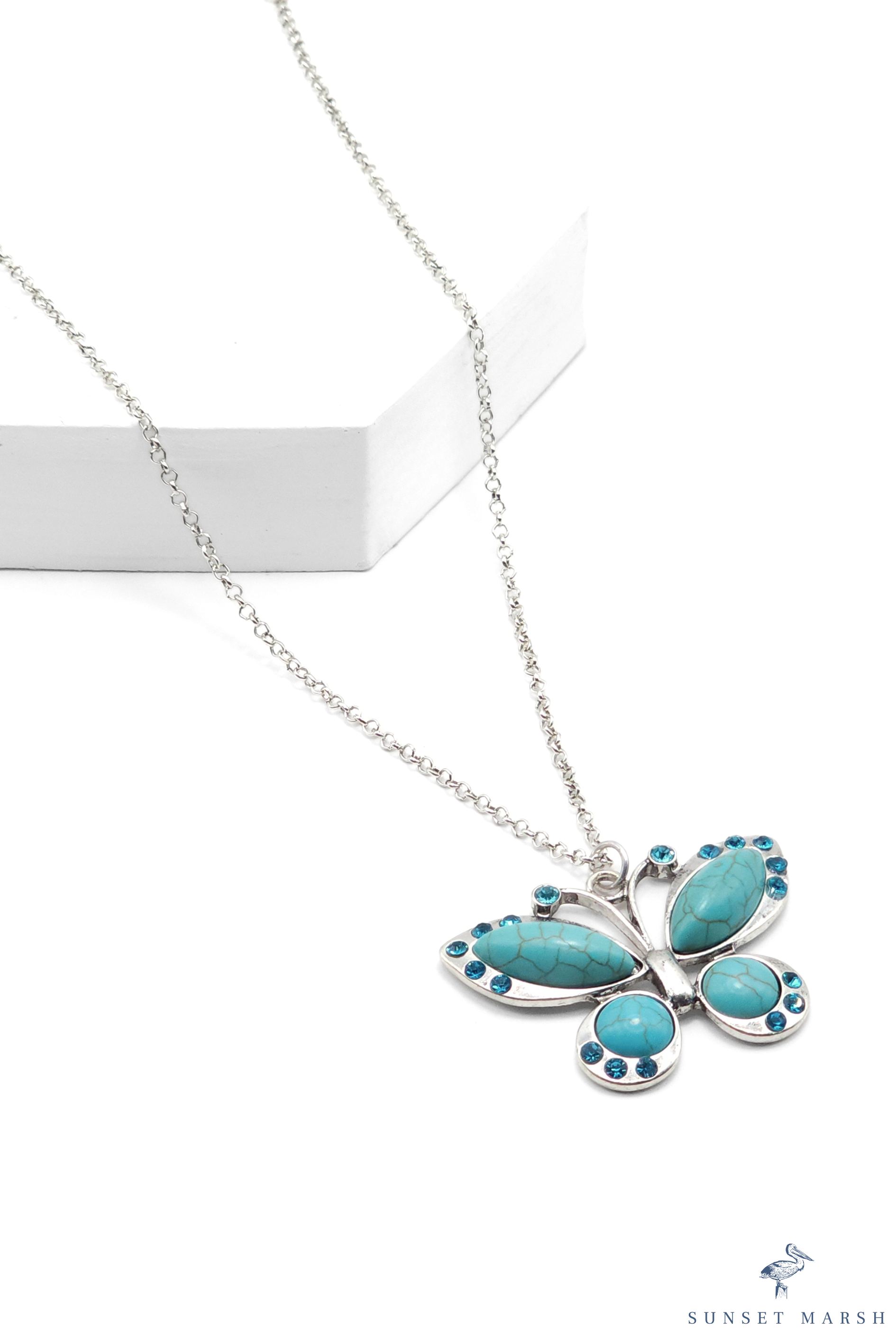 This charming necklace showcases a silver-tone butterfly pendant adorned with vibrant turquoise stones. Each wing features a smooth marbled stone at the center, surrounded by tiny round turquoise accents that add depth and sparkle. The butterfly is gracefully suspended from a delicate silver chain, creating a whimsical, nature-inspired statement that brings a touch of boho elegance to any outfit. Light, bright, and full of personality, this piece is perfect for free spirits and lovers of all things colorful and uplifting.