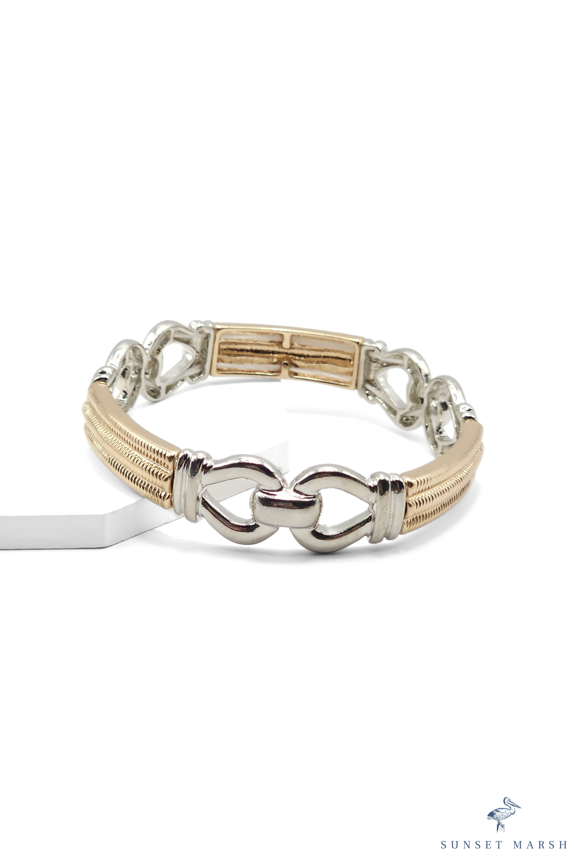 This stylish two-tone bracelet blends sophistication with a modern edge, featuring a mix of polished silver and brushed gold finishes. The design showcases interlocking link accents and textured detailing that add depth and dimension, creating a bold yet refined look. With its sturdy clasp and high-shine finish, this bracelet is perfect for adding a touch of elegance to everyday wear or enhancing a dressy ensemble with timeless appeal.