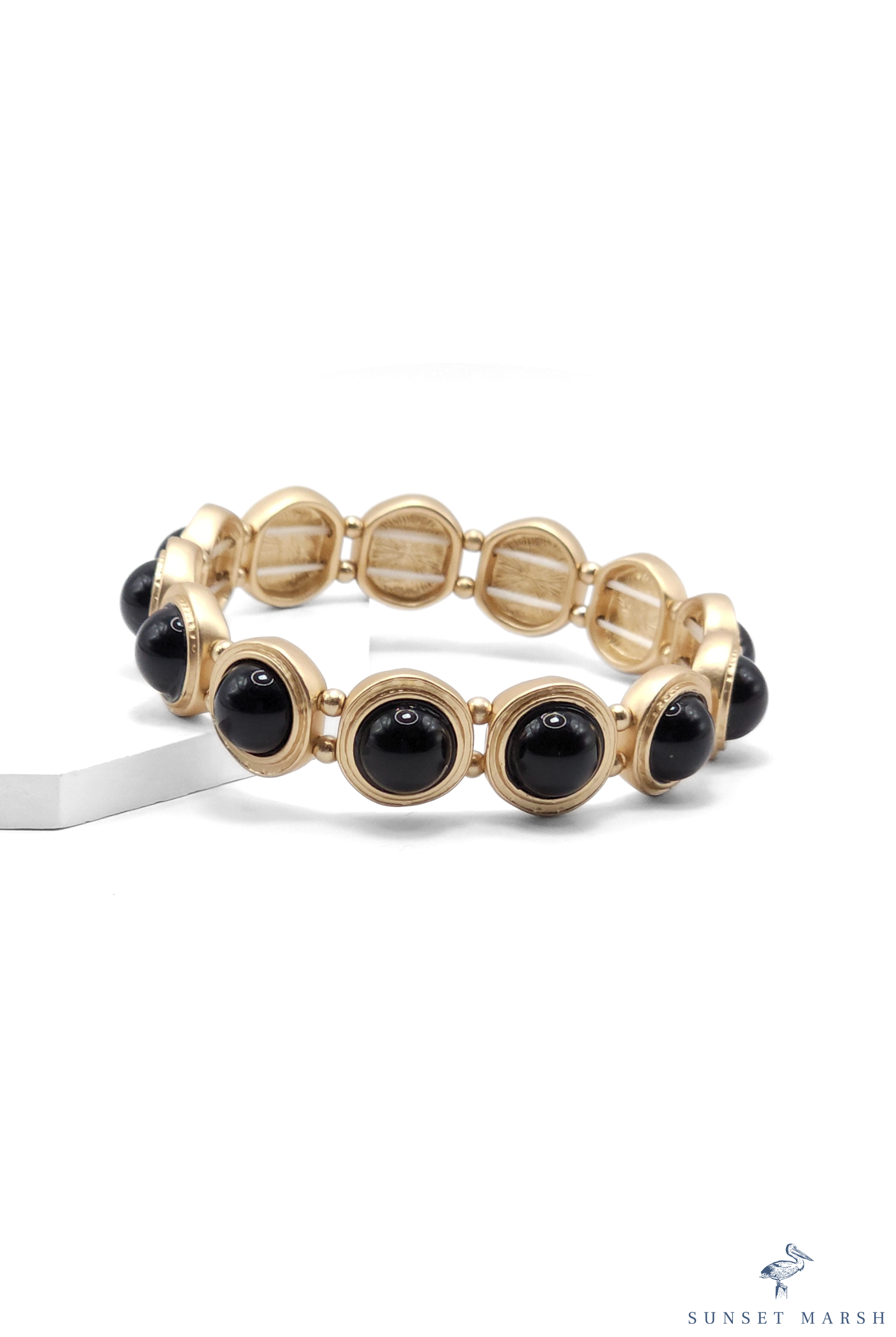 Sleek and sophisticated, this stretch bracelet combines rich black cabochon beads with luxe gold-tone frames for a timeless yet modern look. The rounded design offers bold contrast and smooth texture, making it perfect for stacking or wearing solo as a statement piece. Elastic stretch ensures a comfortable fit for all-day elegance.