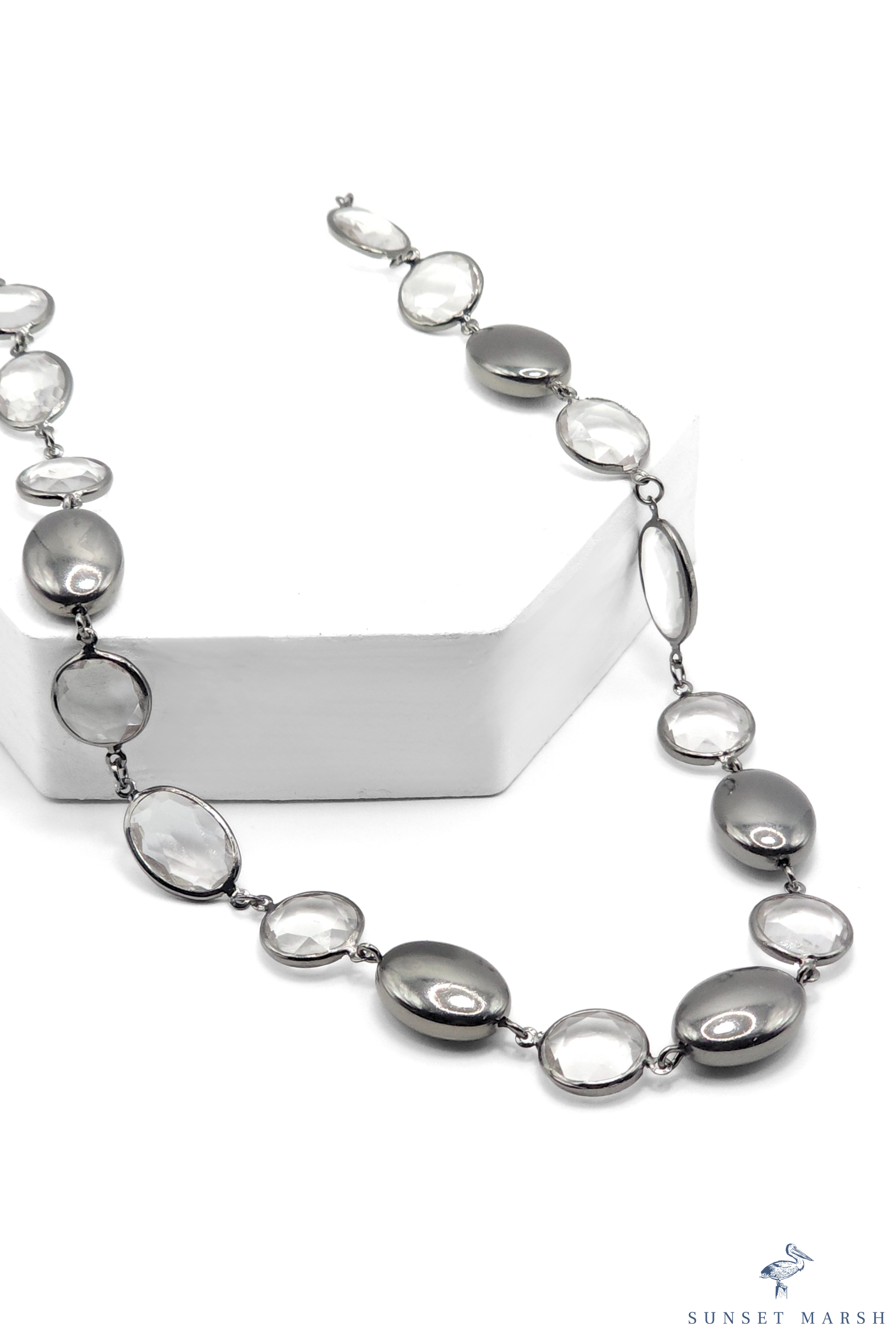This sleek and modern necklace showcases a beautiful interplay of glossy silver-toned metal ovals and crystal-clear links. Each element is carefully connected to create a fluid, lightweight design that moves gracefully with you. The alternating textures of polished metal and transparent resin add a contemporary edge while keeping the overall look refined and timeless. Whether worn with a simple blouse or an elegant dress, this versatile piece delivers a subtle statement that’s both chic and sophisticated—perfect for everyday wear or special occasions.