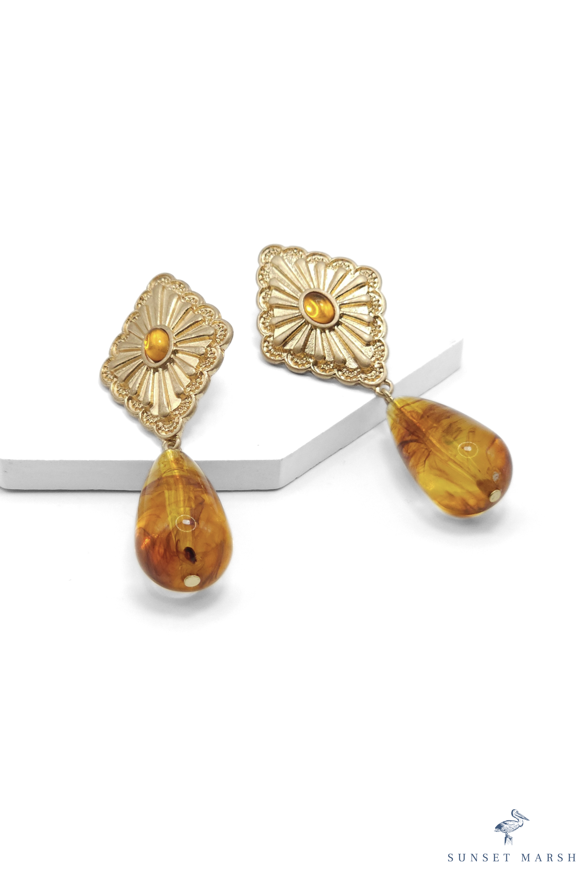 These golden statement earrings blend vintage charm with modern elegance, featuring a scalloped diamond-shaped top embossed with a radiant floral design. Suspended below, a glossy amber-hued teardrop adds warmth and sophistication, catching the light with every movement. The mix of intricate metalwork and rich marbled tones creates a timeless, refined look that pairs beautifully with both casual and dressy outfits. Perfect for adding a touch of golden glow to any occasion, these earrings effortlessly exude bold femininity and classic style.