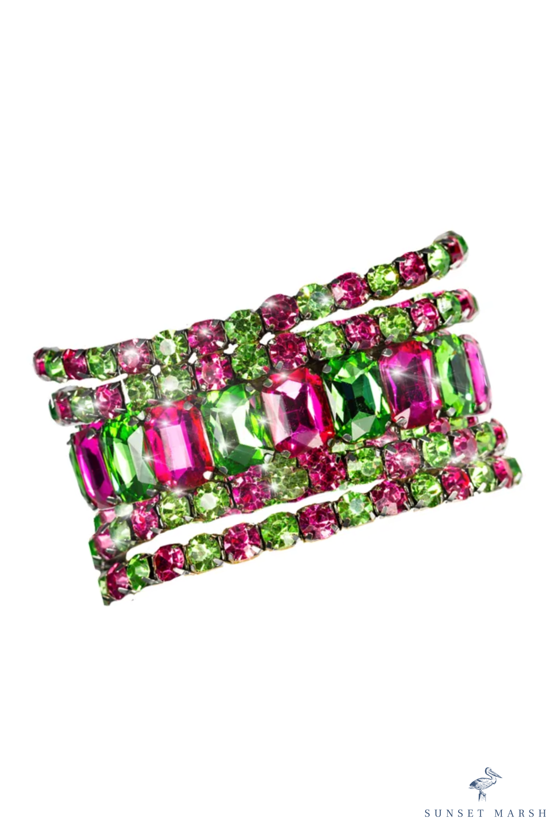 Get ready to turn heads with a burst of juicy color! Our "AKA Wicked Wonderland" 5 strand bracelet layers vibrant pink and lush green crystals for a look that's as fresh and fabulous as a garden in full bloom. Bold, playful, and totally irresistible — it’s the perfect pop of sparkle to brighten any outfit (and your day)!