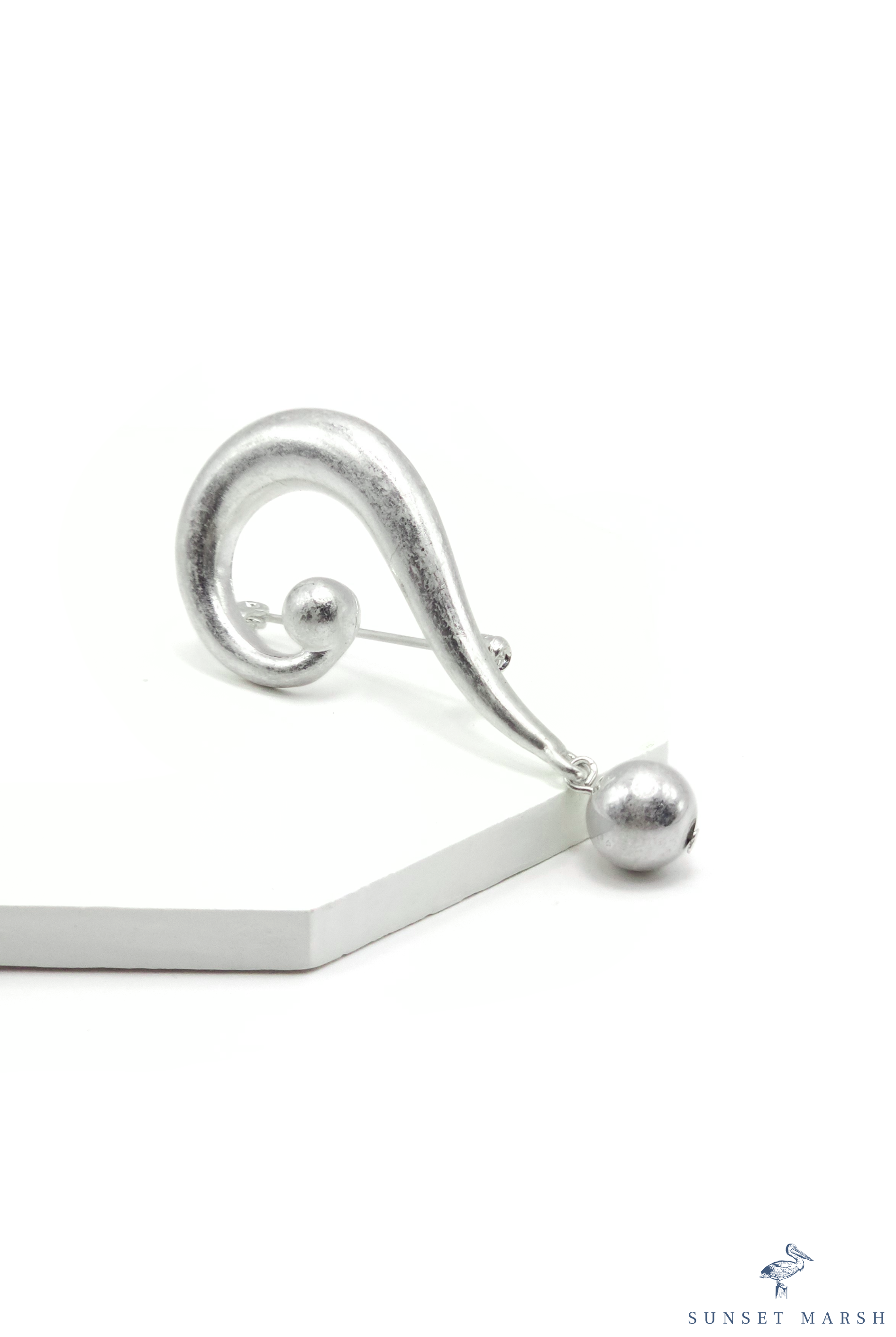 This sleek and sculptural silver brooch blends modern artistry with timeless sophistication. The smooth, curved swirl design evokes a sense of graceful movement, while the polished metallic spheres add balance and refined texture. Eye-catching yet minimalist, this brooch is perfect for dressing up a jacket, scarf, or blouse with a touch of creative elegance. Whether worn for a special occasion or as an everyday statement, it radiates contemporary charm and artistic confidence.